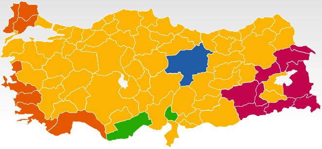 Bir kere bu tür haritalar yapılırken iller o bölgeden en çok oy alan partinin rengine boyanır. Yani bir ili AKP %30 ile kazanmış iken DSP %20 ve CHP %20 almışsa o il AKP’nin olur, turuncu boyanır. Bekir Bey’in faşist kurallarına göre o ilin zavallı insanları da yobaz, karı döven filan olurlar. Yok eğer AKP %20 ve Saadet Partisi %20 alırken %30 ile CHP malı götürmüşse bu sefer o il Bekir’in gözünde şarapçı ve operacı, haliyle uygar bir il olur.