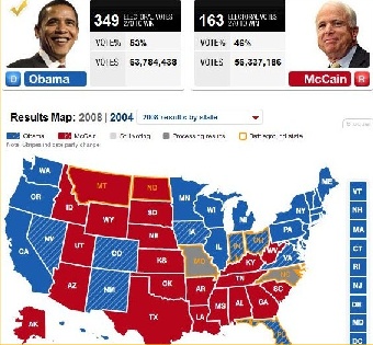 Obama’nın kazandığı seçimlerin sonucuna göre renklendirilmiş bu harita da size ancak sınırlı bir bilgi verecektir. ABD’nin iç kesimleri daha tutucu, dindardır. Kıyı kesimleri ve büyük şehirler azınlıklara karşı daha meraklı ve açıktır. Teksas ırkçılığı ve silah merakı ile tanınan bir eyalettir. Obama gibi zenci bir adaya en çok oy vermesi beklenenler grupların arasında zenciler, katolikler, eğitim seviyesi yüksek olanlar ve savaş karşıtları ve Bush döneminde sıkıntı çekmiş fakirler vardı. Ama Obama çok iyi eğitim almış, elit sayılabilecek bir insandı. Yani öyle halkın bağrından kopup gelmiş bir gariban değildi.