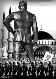 Bu durum, yeni-İslamcılar ile laiklerin arasındaki irade savaşından da fazlası; hatta tekrar baş gösteren yeni ve tehlikeli bir anayasa krizinden de fazlası. Bu, herşeyden öte, iki uyumsuz rakip müessesenin üstünlük için sürtüşmesi: Biri kendilerini  (Modern Türkiye’nin babası) Mustafa Kemal Atatürk’ün laik, cumhuriyetçi mirasçıları olarak gören geleneksel şehirli seçkinler; diğeri muhafazakar ve Anadolunun dine bağlı gelenekleri ile modern fakat Müslüman orta kesimini birleştiren yeni AKP müessesesi.