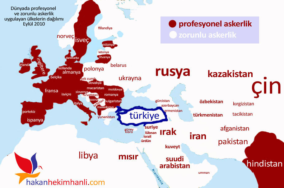Yukarda ki haritaya baktığımızda görülen durum açık ve net gösteriyor ki Türkiye’nin zorunlu askerlik tercihi çokta yanlış görünmüyor. Asker-millet tanımlaması yapılan Türkiye milleti için zorunlu askerlikte aslında tarihten gelen askeri bir gelenek. Ama öyle bir zamanda yaşıyoruz ki artık bazı gelenekleri terk etmemiz, bazılarını da zamana uydurmamız şart. Bu geleneklerin başında da askeri eğitim ve askeri mantığımız gelmeli diye düşünüyorum.