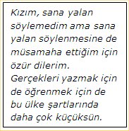 Buradan sonrası kızım için: “Kızım, sana yalan söylemedim ama sana yalan söylenmesine de müsamaha ettiğim için özür dilerim. Gerçekleri yazmak için de öğrenmek için de bu ülke şartlarında daha çok küçüksün.”Yalan” üzerine kurulan bir eğitim sisteminin çok fazla zararları varsa da iki olumlu tarafı olduğunu sen de zamanı gelince öğreneceksin; birincisi ve en önemlisi kainatta birden fazla tanrıya hiç ihtiyaç olmadığı fikridir. Zaman ilerledikçe bugün sana tanrı veya yarı tanrı olarak öğretilenlerin senin, benim gibi insan olduğunu öğreneceksin. Hatta bunun geyiğini bile yapacaksın günü geldiğinde: “Çok fazla tanrının yararı olsaydı Hindistan’a olurdu” gibi. Sizin jargonlarınıza, diskurlarınıza yaşım itibarıyla epey uzak olmam hasebiyle aklıma bu örnek geldi. Daha iyisini bulmak sana kalmış.Birincisi kadar olmasa da bu sistemin ikinci iyi tarafı da şu ki, yaklaşık yirmi senede öğrendiğin deli saçmalarını unutman ve yerine yenilerini koyman uzun sürmüyor.Araştırırsan, gerçeğin peşine düşersen, azmedersen, kelle koyarsan on senede gözlerinin mavisi kadar billur bir imbikten geçmiş tertemiz bir bilinçle hayatı karşılamaya hazırlanırsın. Muhtaç olduğun kudret de babandan sana kalacak olan bin küsur kitaptan müteşekkil kütüphanedir. Bunları seninle konuşabilseydik şayet muhtemelen bana gözlerini dikip: “tamam da baba, neden onca yılı yalanla geçiriyoruz?” diye sorardın. Bu hal muhtemelen sadece bize özgü olduğu için bunun net bir cevabı da yok kızım. Eş dost duymasın ama sana tavsiyem şu olur: Fincancı katırlarını ürkütmekten korkma. Bununla beraber şairin belletmeye çalıştığı “zulmün önünde eğil, hakkın önünde eğil/ Taçlar bile dünyada eğilen başlarındır” diskurunda sadece işin “hak” tarafını al o kadar.