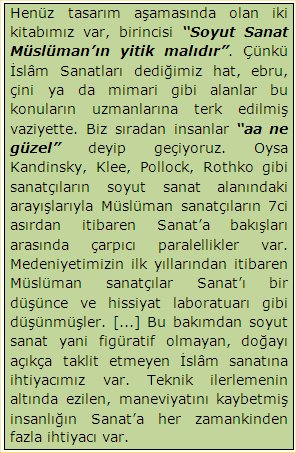 Bu bakımdan soyut sanat yani figüratif olmayan, doğayı açıkça taklit etmeyen İslâm sanatına ihtiyacımız var. Teknik ilerlemenin altında ezilen, maneviyatını kaybetmiş insanlığın Sanat’a her zamankinden fazla ihtiyacı var. Bu kitap işte bu kapıyı aralayacak nasip olursa: Güzellik ile Adalet arasındaki bağlantıya ışık tutacak.