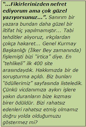 Tabi tehditler alıyoruz, ırkçılardan çokça hakaret… Genel Kurmay Başkanlığı (İlker Bey zamanında) fişlemişti bizi “irtica” diye. En tehlikeli ilk 400 site arasındaydık. Hakkımızda bir de soruşturma açıldı. Biz bunları “ödüllerimiz” sayfasında listeledik. Çünkü vicdanımıza aykırı işlere yakın duranların bize kızması birer ödüldür. Bizi rahatsız edenleri rahatsız etmiş olmamız doğru yolda olduğumuzu göstermez mi?