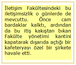 İletişim Fakültesindeki bu iletişimsizlik o günlerde de mevcuttu. Önce cam bardaklar kalktı, ardından da bu itiş kakıştan bıkan Fakülte yönetimi kantini kapatarak dışarıda açtığı bir kafeteryayı özel bir şirkete havale etti. İtişip kakışarak da olsa bir şekilde iletişim kuran bir kuşağın sonunu getiren de bu karar oldu. Devir artık pahalı arabalarla okula gelen, 501’i bir rakamdan ziyade bir sınıfın sembolü olarak gören beyaz Türklerin devriydi. Çünkü kafeterya pahalıydı…