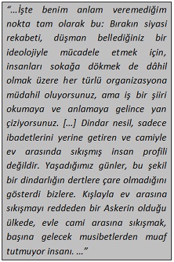 Dindar nesil, sadece ibadetlerini yerine getiren ve camiyle ev arasında sıkışmış insan profili değildir. Yaşadığımız günler, bu şekil bir dindarlığın dertlere çare olmadığını gösterdi bizlere. Kışlayla ev arasına sıkışmayı reddeden bir Askerin olduğu ülkede, evle cami arasına sıkışmak, başına gelecek musibetlerden muaf tutmuyor insanı. Hoş, 28 Şubat Döneminde sıkça rastladığımız, fakültelerin önünde naçar bekleşen başörtülü kızlarımızı görünce bunun da yeterli olmadığını gördük ya neyse.
