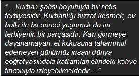 Kurban şahsi boyutuyla bir nefis terbiyesidir. Kurbanlığı bizzat kesmek, ev halkı ile bu süreci yaşamak da bu terbiyenin bir parçasıdır. Kan görmeye dayanamayan, et kokusuna tahammül edemeyen günümüz insanı dünya coğrafyasındaki katliamları elindeki kahve fincanıyla izleyebilmektedir. Kurbanın bir de toplumsal boyutu vardır ki günümüz Müslümanları daha çok bu kısımla hemhal olmuştur. Kesimhaneden gelen etleri dağıtmakta ve gelen misafire kavurma ikram etmekte pek bir maharetliyizdir.