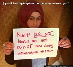 Müslüman kadınların, FEMEN’in “Üstsüz Cihad Çağrısı”na cevaben açılan Facebook grubuna “Muslim Women Against FEMEN” (FEMEN’e Karşı Müslüman Kadınlar), “Çıplaklık bizi özgürleştiremez” mektubuna ve eylemlerine şuradan ulaşabilirsiniz: http://www.dipnot.tv/ciplaklik-bizi-ozgurlestirmez-musluman-kadinlardan-femene-mektup/