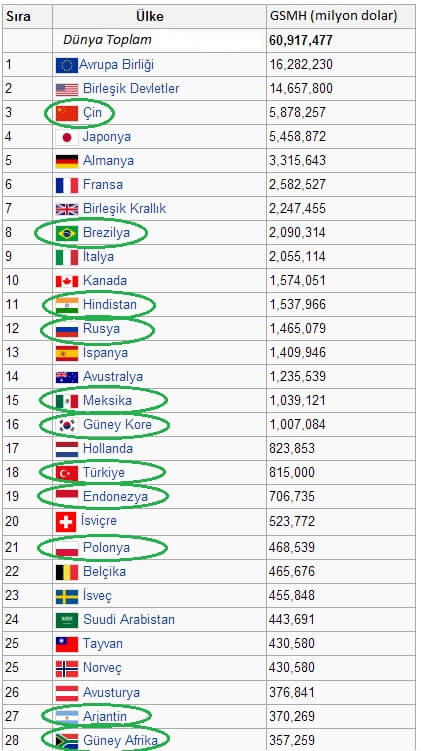 Dünyada 180’den fazla ülke var ama G20 ülkeleri dediğimiz en zengin 20 ülke aynı zamanda en etkili olanlar. Aralarında Türkiye’nin de bulunduğu bu ilk 20 dünya ticaretinin %85’ini ellerinde bulunduruyorlar; bütün ülkelerin GSMH’ların toplamı da büyük bir paya sahip (%90). Dünya nüfusunun üçte ikisi yine bu 20 ülkede olduğundan G20’ye sadece bir “zenginler klübü” gibi görmek doğru olmaz; G20 uluslararası meselelerde meşru bir karar mekanizması olmaya aday. Buna ek olarak BM’in etkin biçimde işlemediği, veto hakkı bulunan güvenlik konseyi üyeleri yüzünden herşeyin kilitlendiği bir gerçek. Ayrıca en zengin 7 ülke + Rusya’dan oluşan G8 ülkelerinin dünya ekonomisi içindeki payları 1989’da %70 iken 2009’da %55’e düştü. 2008 kriziyle birlikte bir tür kutuplaşma çıktı ortaya, G20 ülkeleri iki gruba ayrıldılar: Hantallar ve dinamikler. Aşağıdaki listede ismi işaretlenen ülkeler dinamik olanlar.