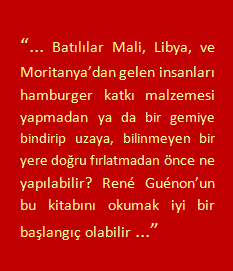 Batılılar bu sefer de Mali, Libya, ve Moritanya’dan gelen insanları hamburgerlerine katkı malzemesi yapmadan ya da onları bir gemiye bindirip uzaya, bilinmeyen bir yere doğru fırlatmadan önce ne yapılabilir? René Guénon’un bu kitabını okumak iyi bir başlangıç.