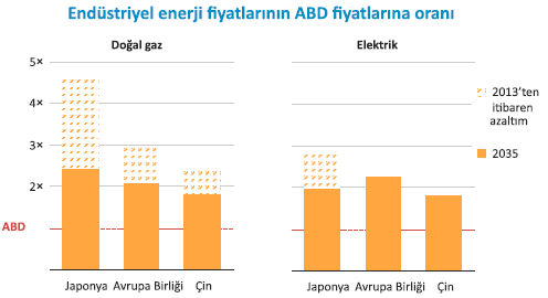 En az 20-30 sene boyunca enerji fiyatlarındaki farklar devam edecek. Bugünkü teknolojik ve ekonomik bilgiler bunu gösteriyor. Elektriğin önemli bir kısmı doğal gazdan üretildiği için elektrik fiyatlarında da ABD bu avantajı koruyacak. Ek olarak Almanya’nın nükleer enerjiden tamamen çıkması, Fransa’nın nükleer elektrik payını %75’den %50’ye çekmek istemesi yine ABD’nin lehine.