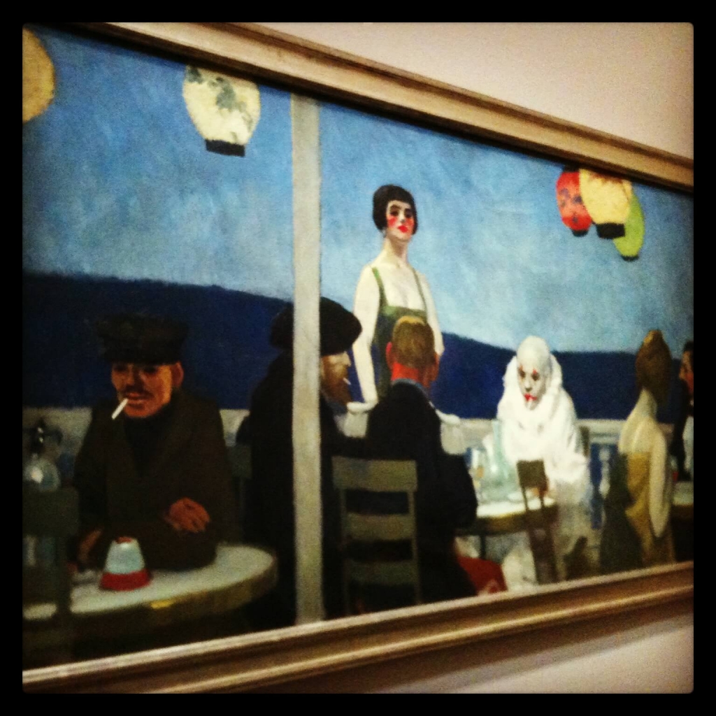 İsmini Arthur Rimbaud’nun şiirinden alan bir tabloya bakıyoruz, “Soir Bleu”, 1914, Whitney Museum, New York. İhtimal Edward Hopper’ın Fransızca isim verdiği tek eser bu. (Büyük görmek için tıklayın) Bir Paris sahnesi. Beceriksizce abartılmış makyajı ve “meslek” için fazla mağrur duruşu rolüne giremeyen fahişenin bir dişi değil insan oluşunu ele veriyor. Etinin beyazlığı ile zıtlık arz eden kırmızı yüz pudrası bir maske gibi durmuş; fahişeliğin bir hüviyet değil rol olduğunu vurguluyor sanki.
