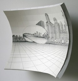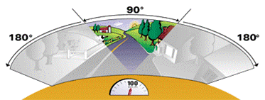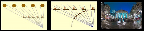 Gözün retinası küreseldir de ondan. Yani “görme” dediğimiz süreçte ışık düz bir ekrana değil eğri bir yüzeye gelir. Eğer görme açımızın dar bir kısmını kullanırsak fark ihmal edilebilir ama gerçek görme tecrübesinde bu açı oldukça geniş. Bu genişlik sebebiyle yüzeyler arasındaki fark ciddi görüntü kayıplarına ve bükülmelere yol açar. Meselâ yukarıdaki resme dikkat edin: Aynı genişlikte ve birbirine eşit mesafede olan cisimlerin düz zemindeki izdüşümü uzaklıkla doğru orantılı olarak büyüyor. A’nın boyu B’den büyük, B’ninki C’den… Bu temsil gerçek görme tecrübesine tekabül etmiyor çünkü eğri bir yüzeyde uzaklaşan cisimlerin izdüşümü küçülür. Göze uygun bir izdüşüm için uzaklaşan cisimler daralan açılarla küresel bir zeminde resmedilmeliydi. En sağdaki karedeki gibi “balık gözü” objektifle çekilen fotoğraflar böyle bir izdüşümün neye benzeyeceğini gösterebilir.