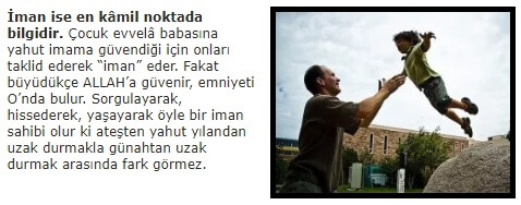 • İmanı olmayanlar kendilerine “kör” demezler çünkü gerçek görmeyi hiç tatmadılar. Onlar iman edene bazen “şanslısın” derler ama çoğu kez “saf” hatta deli. Zira imanı inançla karıştırırlar. İMaN, ALLAH’ın eMNiyetini hissetmektir; babanın veya imamın sözlerine inanmak değil.