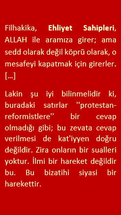 ”Protestan-reformistlerin” i’tirazlarının kaynağı, insanla Hakikat (ve Hakk) arasında mesafe olmadığı yanılgılarına düşmeleridir. Böyle olduğunu zannedince; Ehliyet Sahiplerinin, ”ALLAH ile aramıza” girdiğini zannetmeleri çok normal olur. Halbuki, eğer insanlarla Hakikat arasında mesafe olmasa, hem Peygamberlere ihtiyaç kalmaz herkes Peygamber olur, hemde arz üzerinde kafir kalmaz herkes Mü’min olurdu. Filhakika, Ehliyet Sahipleri, ALLAH ile aramıza girer; ama sedd olarak değil köprü olarak, o mesafeyi kapatmak için girerler.