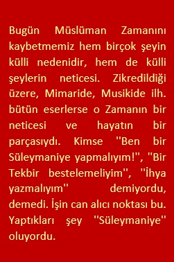 ”Müslüman Zamanının” ”tütmesi”, Hakikatin bütün boyutlarıyla vucud bulmasının, bulabilmesinin bir neticesidir. Vecd Halidir. Kemaldir. Hakikatin dünyasının çocuklarının da, herhangi bir dünyanın çocuklarının da bilseler de bilmeseler de menzilleridir burası. Dolayısıyla bugün biz inkıraz yaşıyan bizlerin de farkında olalım veya olamayalım, uğruna çaba sarf ettiğimiz bir şey varsa eğer; bunun içindir. Lakin burada kafamız karışıyor. ”Nedenlerle sonuçları birbirine karıştırmaktan” alıkoyamıyoruz kendimizi. Bugün Müslüman Zamanını kaybetmemiz hem birçok şeyin külli nedenidir, hem de külli şeylerin neticesi. Zikredildiği üzere, Mimaride, Musikide ilh. bütün eserlerse o Zamanın bir neticesi ve hayatın bir parçasıydı. Kimse ”Ben bir Süleymaniye yapmalıyım!”, ”Bir Tekbir bestelemeliyim”, ”İhya yazmalıyım” demiyordu, demedi. İşin can alıcı noktası bu. Yaptıkları şey ”Süleymaniye” oluyordu. Bizim bugün İslam Sanatlarını, İslam Düşüncesini diriltme gibi fikirlerimiz ve fiillerimiz(Hatta İslam Sanatı diye bir şeyden bahsetmemiz bile); Müslümanca bir Zihne, Zemine ve Zamana ne kadar uzak olduğumuzu, aramızda mesafe olduğunu geçtim; uçurumlar olduğunu gösteriyor yalnızca. Taşıma suyla yolmaya çalışmaya benziyor bu. Halbuki bizim yapmamız gereken Gönlümüzden dışarı, ve Gökkubbeden aşağı akacak nehri fışkırtmak. Kökünden çürüyen bir ağacı, aşı yaparak kurtaracağınızı zannederseniz, her şeyi mahv edersiniz! O kadar!