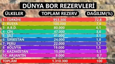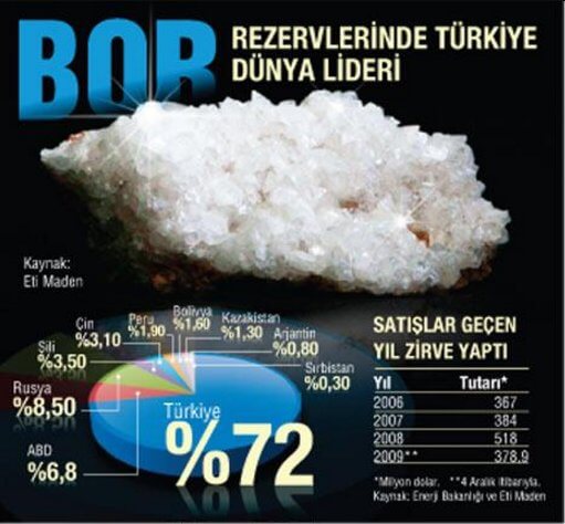 - İleride Türkiye’de bolca bulunan bor sayesinde sıvı piller yapılabilir. Bu elektrikli araçların pil doldurma süresini birkaç dakikaya çekebilir. Tabi Türkiye için muazzam bir gelir kapısı.